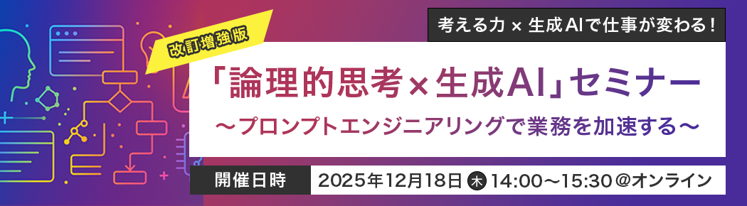 本無料セミナーでは、弊社の人気講座「プロンプトエンジニアリング・トレーニング ~生成AIを論理的思考に活かす~」から、実践的なハンズオン部分を抜粋。