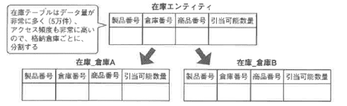 図3-8の例では、在庫エンティティにアクセスが集中するため、倉庫ごとに在庫表を分けて別表としています。 これは、在庫表は倉庫別に異なるレコードを格納することが要件で明らかになっており、ユーザによってどの倉庫にアクセスするかがほほ固定されていることがわかっていたため、分けて管理してもよいという判断ができたためです。